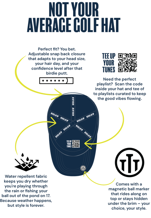 With breathable, adjustable, and water-repellant materials, this hat is built to keep you comfortable even when you’re building sand castles. Complete with a built-in QR code for course-ready tunes and a magnetic ball marker for those sandy saves, this hat is all about embracing the journey. Limited run, catch one before they disappear like your ball in the sand!